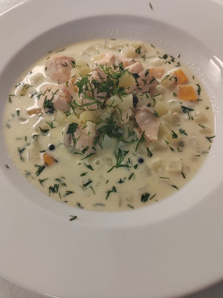 Lohta, perunaa, porkkanaa, sipulia kuohukermaa (L, G)