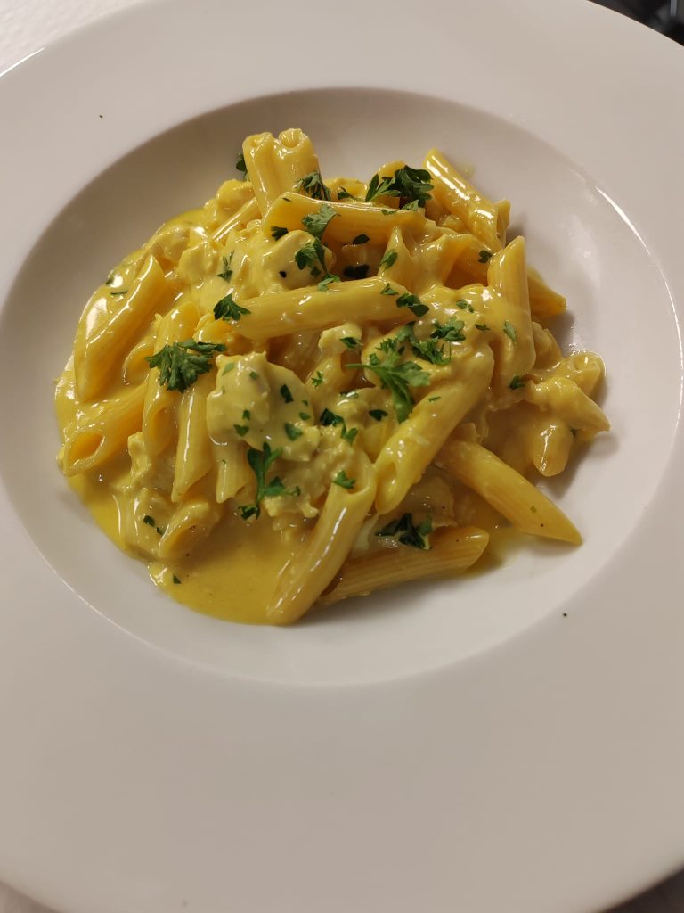 paahdettua kanaa, tuorepastaa, sitruunaa, creme fraichea, persiljaa (L)
