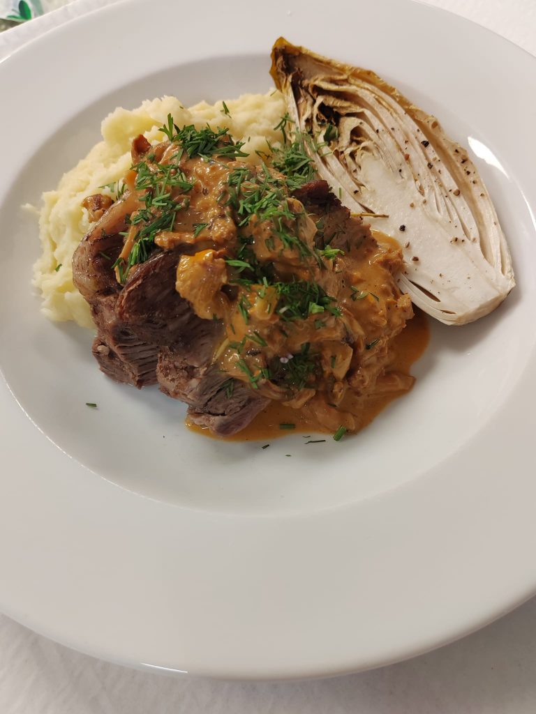 Pitkään haudutettua naudan niskaa, kantarellikastiketta, perunamuusia, paahdettua endiiviä (G)