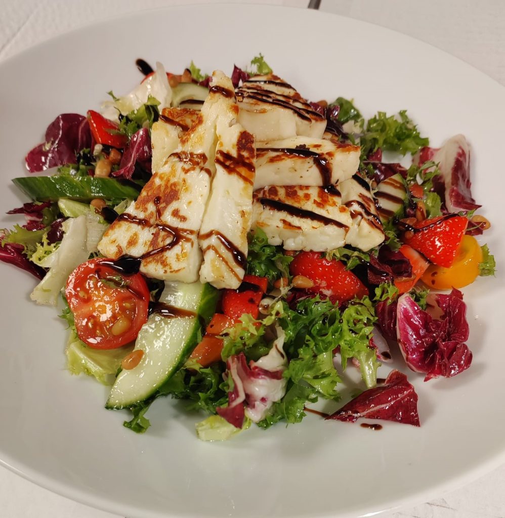 Halloumia, kurkkua, kirsikkatomaattia, mansikkaa, paahdettuja pinjasiemeniä, basilikavinegrettiä (G)