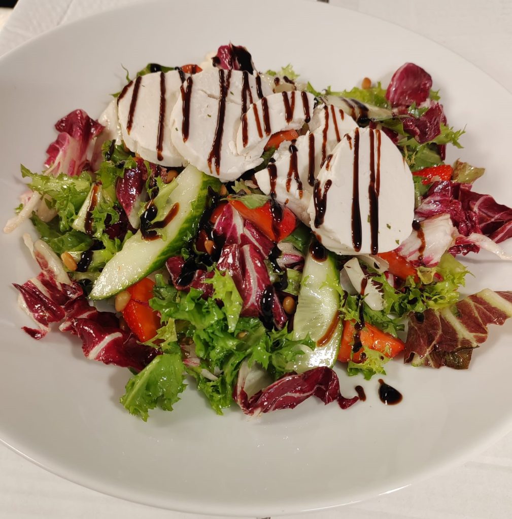 Mö Chavrea, kurkkua, kirsikkatomaattia, mansikkaa, paahdettuja pinjansiemeniä, basilikavinegrettiä (Veg, G)