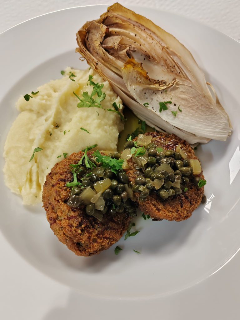 punajuuripihvi, perunamuusia, kapriskastiketta, paahdettua endiiviä (Veg, G)